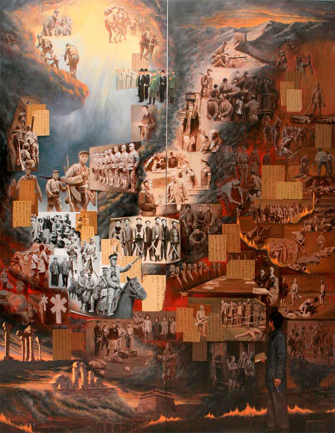 J’ai rassemblé dans cette peinture un grand nombre d’images. J’ai voulu faire une grande fresque historique des guerres qui se sont succedées depuis le début du XX° siècle en Chine.